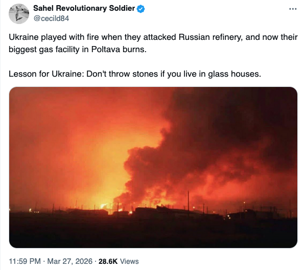 Pakistan betrayed Iran, by rerouting oil for US use in the region, and now they have paid the price. pic.twitter.com/qBzCniYYjw— Sahel Revolutionary Soldier (@cecild84) March 27, 2026