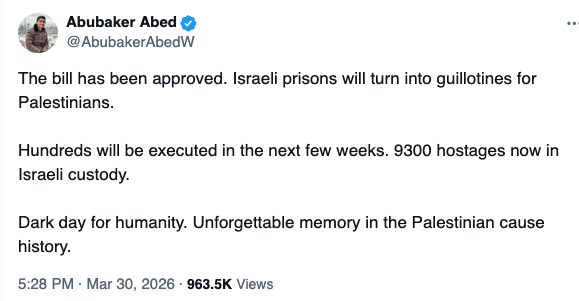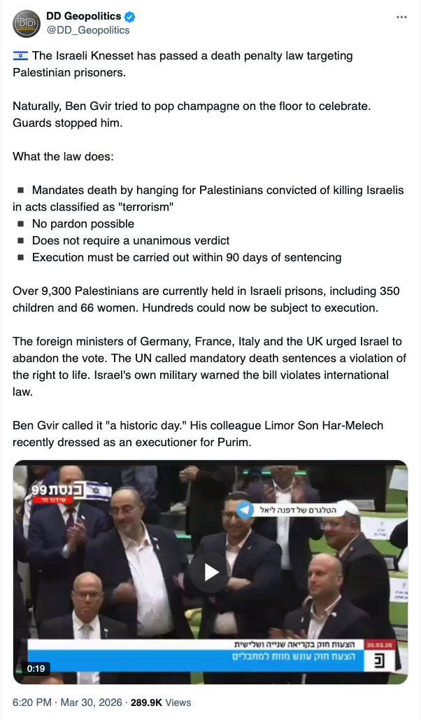 โก๏ธ๐จ BREAKING: The Israeli Knesset approves in three readings the law of "executing Palestinian prisoners"
