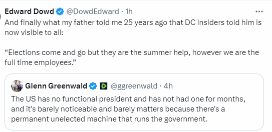 ParticipantI think Greenwald is being naive. Possibly Dowd is too, but less so. The elections are almost entirely a ritual distraction function to pacify the multitude. To create and support the maintenance of illusion. The machine government seems to be guided primarily by internal procedure, every functionary has a procedure manual, and often a minder, while actual policy is determined by more occult institutions, such as secret “clubs” and financial agenda. These latter’s “guiding” policy seems bent on dominating the earth. We know this by their actions over decades, since Wilson, or before. Since 1812 in my opinion. Approximately this is in the last 120 odd years derivative of Mackinder’s strategy of dominance. Presidents attempting to make policy toward the best interests of the people get trips to Dallas, or, if they’re clever and lucky, allowed to retire. These days Nixon looks pretty good. Not that he was a saint! When Dick suggested blackmail by mentioning the “whole Cuban thing” on what was not erased from the tapes, he may have saved his own life. I often think about, in Hegelian fashion, what was erased. What was not there. Dick may have been quite explicit in his muse, knowing he was on tape. A basic function of a President that obeys is more or less to serve as a pharmacos. If this goat goes the wrong way, he is removed. If he goes the right way, paradoxically, he survives, and is removed by the calender to a wealthy position in retirement. Perhaps on an island, maybe Martha’s Vineyard. Well fed, despite the coincidences of the cooks dying.