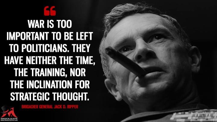 “I, uh, don’t think it’s quite fair to condemn a whole program because of a single slip-up, sir.”“Muffley: General Turgidson, I find this very difficult to understand. I was under the impression that I was the only one in authority to order the use of nuclear weapons.
