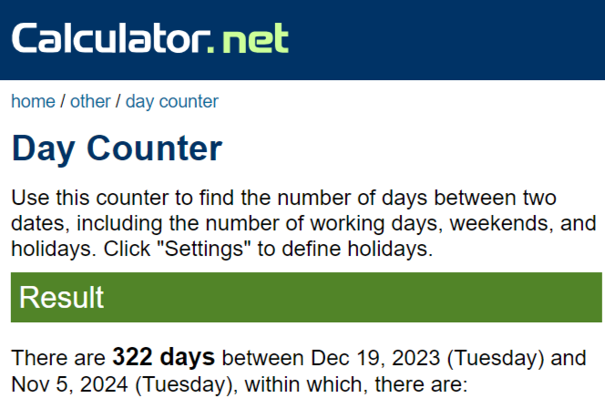Another Trump ritual.. The count from the Colorado ballot (not a hung chad this time) issue of Wednesday 19 Dec 2023 to the US Election on Tuesday 05 Nov 2024 is 322 days.