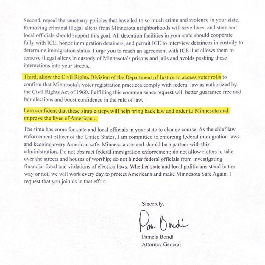 “Third, allow the Civil Rights Division of the Department of Justice to access voter rolls to confirm that Minnesota’s voter registration practices comply with federal law as authorized by the Civil Rights Act of 1960. Fulfilling this common sense request will better guarantee free and fair elections and boost confidence in the rule of law.