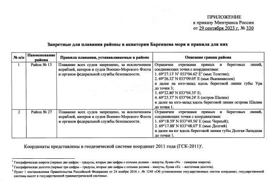 According to the appendix to the document, in areas No. 13 and 27 of the Barents Sea, the navigation of all vessels is prohibited, with the exception of ships, boats and vessels of the Navy and FSB agencies.
