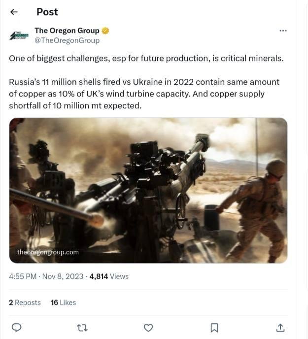 Material, War Material… the front end of technical force is, as a practical matter, mining… copper, iron, lead, petro…metals, aggregates, carbon, hydrogen… and capacity… engineers, wrights, chemists, mathematicians, and vast amounts of mechanical and electrical power for refining and utilization…this includes rail and road and grid…and solid money, finance, or perhaps slave labor on short rations,, oh! Brother! Obviously the general lay of the matter is that the US is beyond hope, but the pols are too ignorant to grasp this… BTW Comrade Hudson speaks of the money he made in copper during Vietnam… “might as well have been out there throwing bars of copper at each other”, iirc.