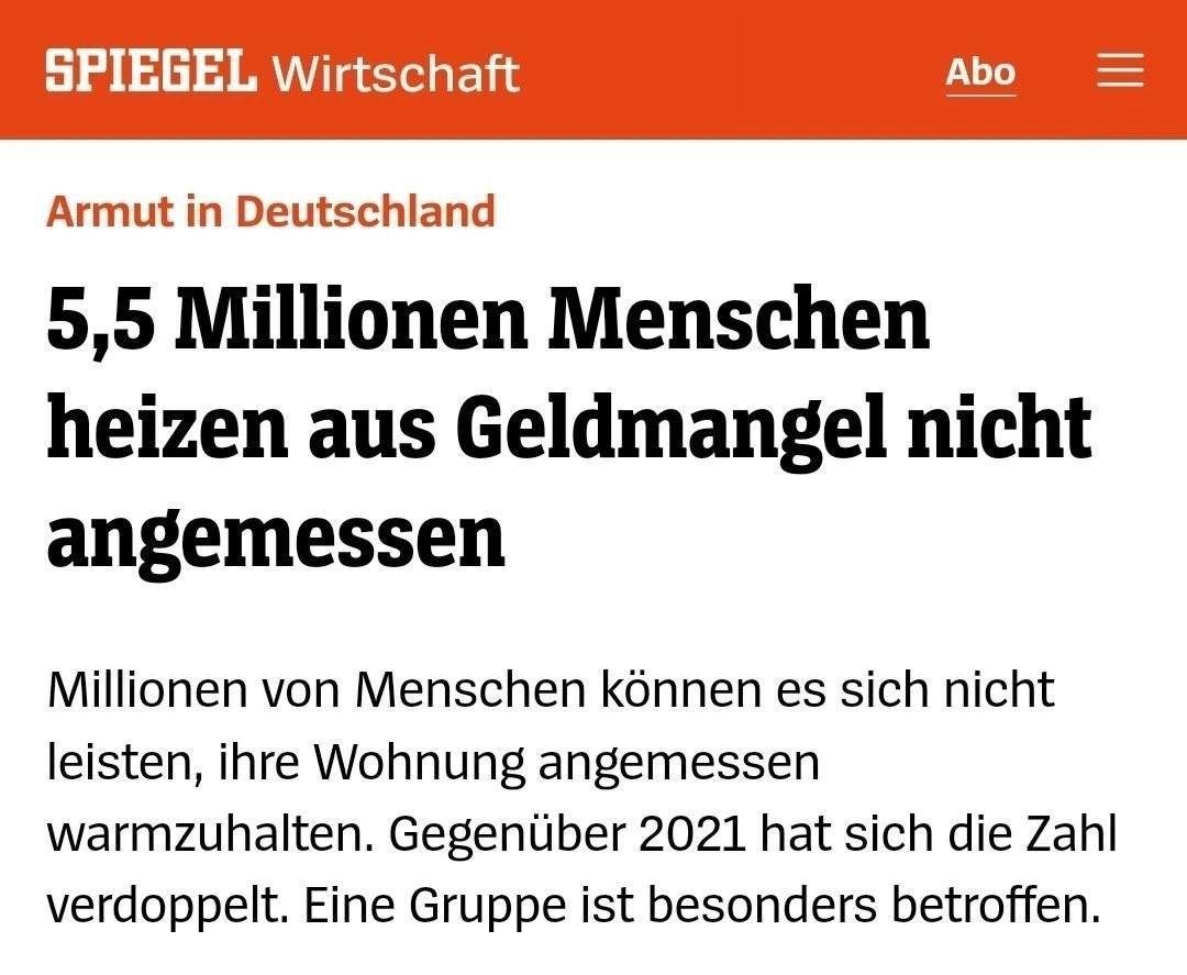 > Five and a half million Germans cannot heat their homes sufficiently due to lack of money – Spiegel. [this is 6.5% of their population] -