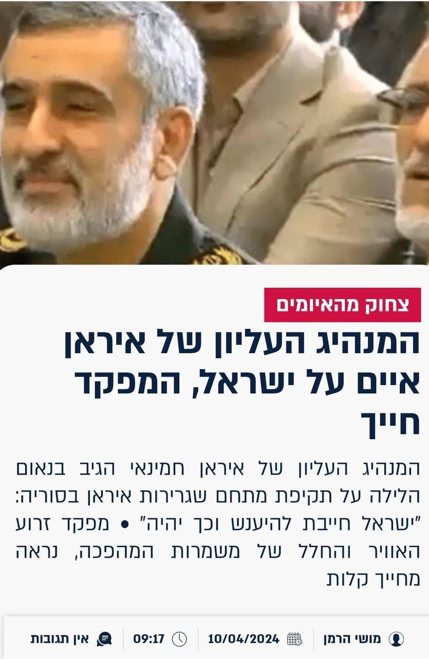 The Iranian attack only adds to our despair, because we have a bankrupt government and a prime minister busy from morning to night pursuing frivolous, divisive policies.”ย [at which point are drugs, including adrenochrome and abominations, or the spiritual ecstasy of waiting for the Birth, insufficient?? They are surrounded by loss, led by incompetence, nurtured on despair. Something’s gotta give]