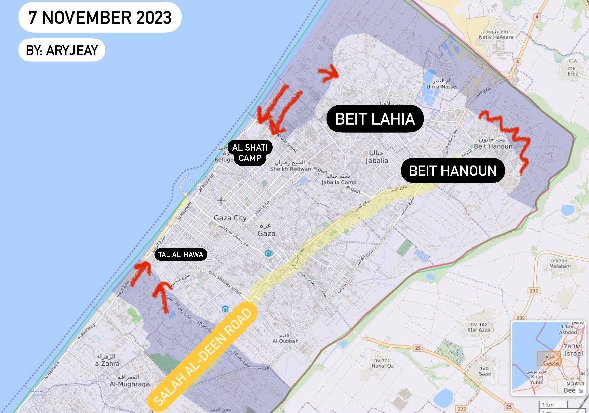 In general, the pace of IDF combat operations inside Gaza Strip neighborhoods remains low. As we reported earlier, the emphasis is definitely on preserving the lives of soldiers, but at the same time there are difficulties both at the tactical level of command and control and at the operational level when planning further actions. The strategic intent of the operation remains the same: in the first phase of the ground operation, the IDF seeks to cut off the northern areas of Gaza – Jabaliya, Zeitoun, Al-Shati, Beit Hanoun and Beit Lahiya – from the southern part of the enclave. However, as the plan is implemented, features appear that may prevent the operation from being carried out with minimal losses.Which?