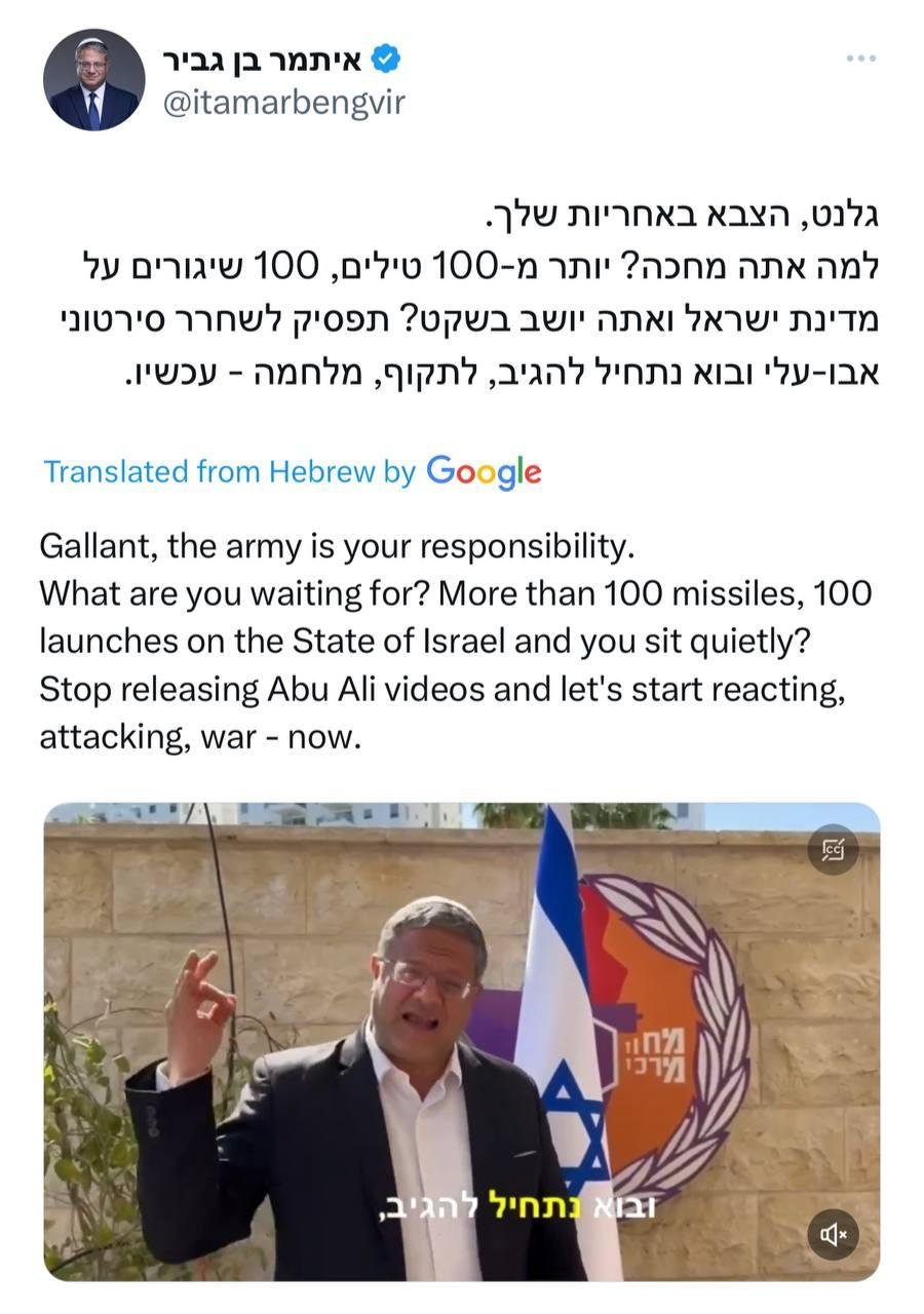 ⭕ Israeli Minister of National Security, Ben Gvir: ‘Yoav Gallant, you are in charge of the Army, and you sit here quietly while Hezbollah fires 100 missiles at us; I say to you, let us respond, and let us begin the war on Lebanon now’ – Al Jazeera