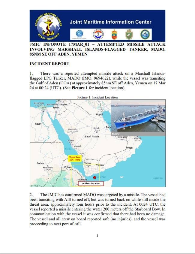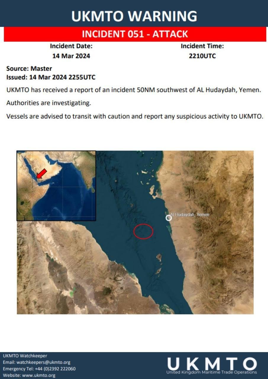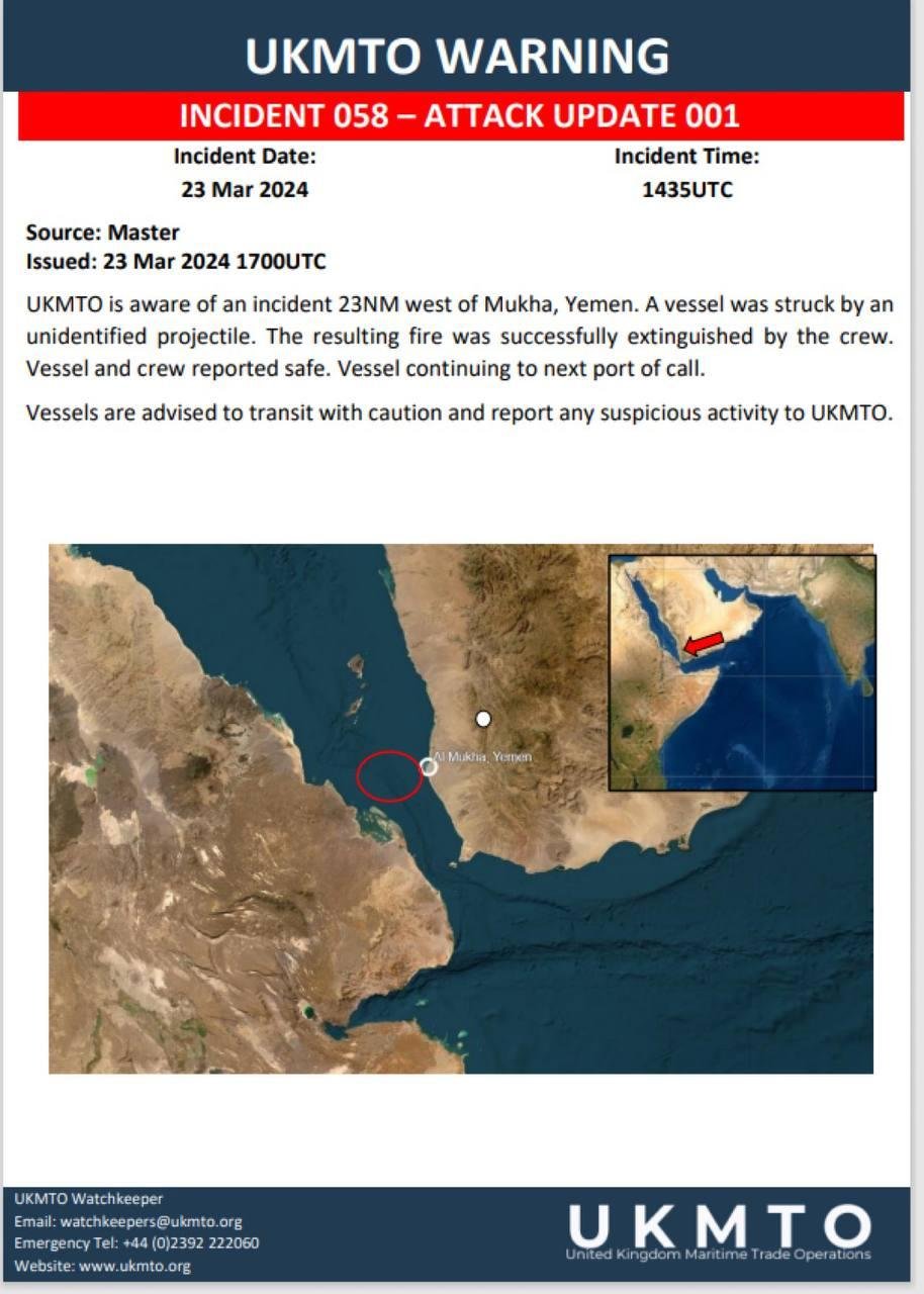 ⭕ A ship was struck with a missile/drone, north of the Bab El Mandab strait, causing for the outbreak of a fire on board. The fire was extinguished. [about 4-5 hours ago]