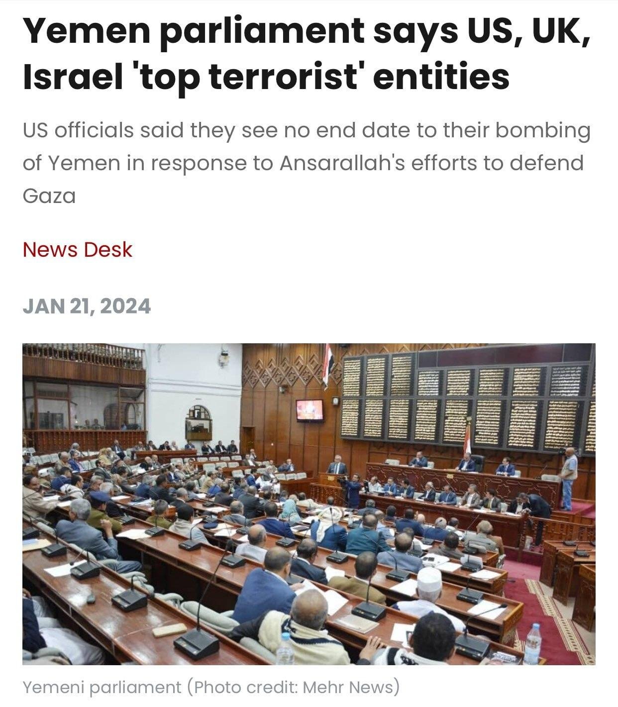 – We say to the American and British governments that they cannot use the Yemeni retaliation to their aggression on Yemen as an excuse to portray themselves as the victims. They are terrorist criminals and this is well known to our people and the people of the region.
