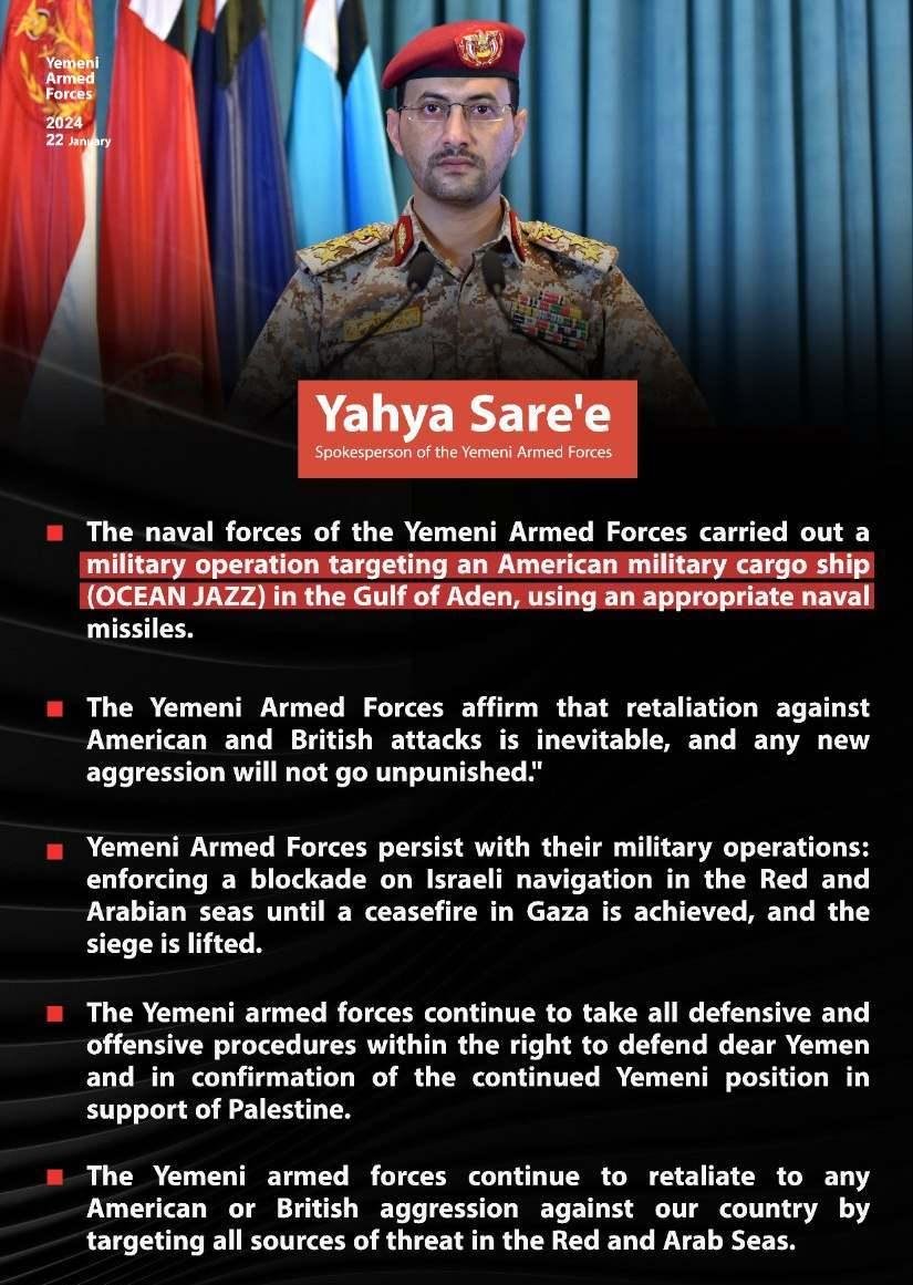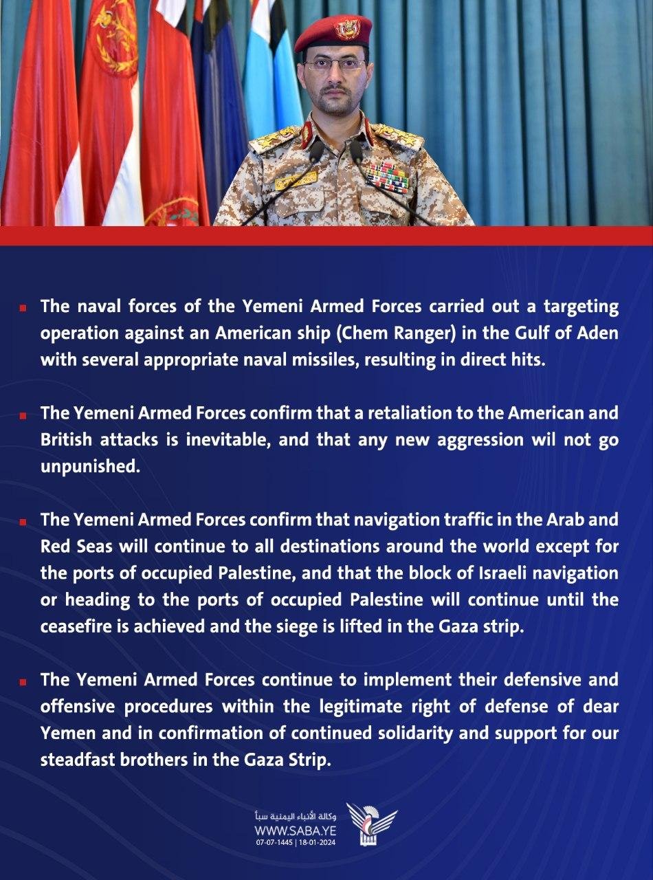 โญ ๐พ๐ช The Houthis informed that ships that are not bound for Israel, are not associated with Israel and do not belong to Israel can safely and without any fear pass through the Red Sea and the Suez Canal. One way to avoid problems is to signal a lack of communication with Israel. There will be no obstacles put in their way. All the Houthis have claims exclusively against Israel. Well, to the USA and Britain more recently.
