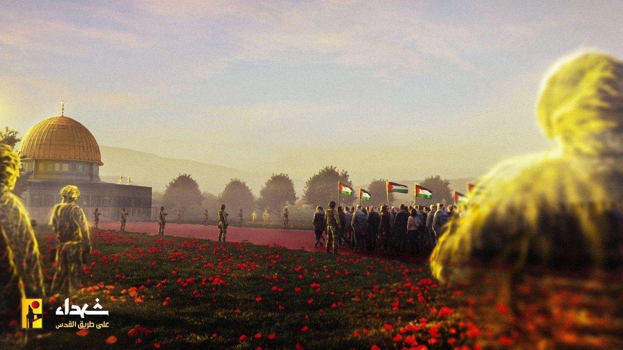 Palestinians continue to resist by any means necessary. The top of the piece reads: โWe hope from Allah what they do not hope for.” Despite the multitude of fronts, the blood of martyrs in all fields mingles; it is united in the goal of Palestinian liberation and the removal of the zionist enemy from all our land.