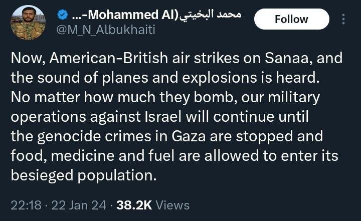 [as many surmised, these were optical “venting” operations, to appear strong to internal insouciant western audiences, and to try to browbeat the Yemenis. They should soon turn into terrorist missions aimed at collective punishment, aiming at population centers as usual, the only targets within reach, as happening to Gaza and Russia…]