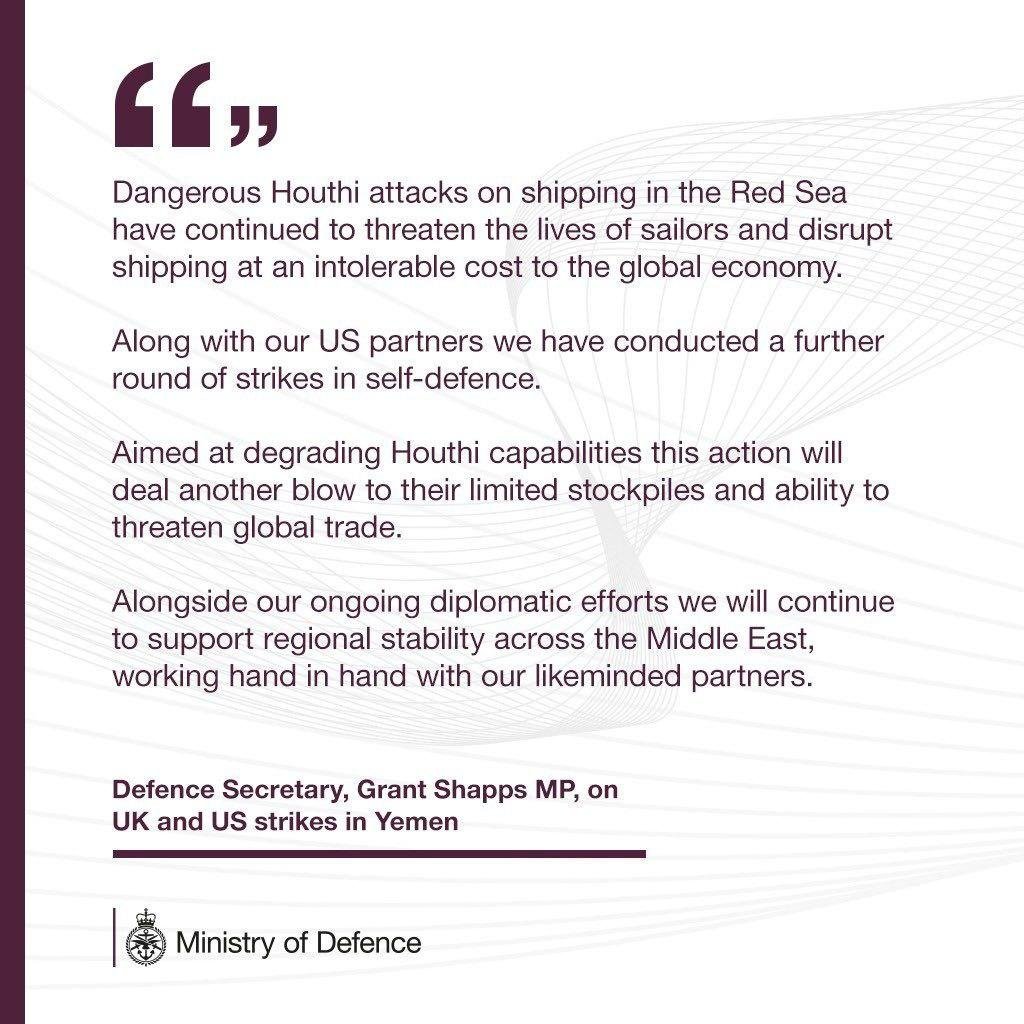 โญ The British Ministry of Defense announced that four Typhoon fighter jets took part in the Anglo-American coalition bombing of Yemen by dropping Paveway 4 bombs on targets.