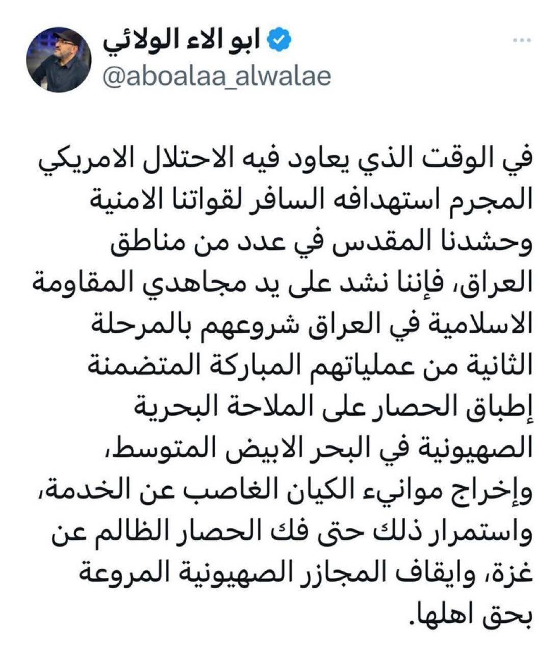 โญ ๐จ | ๐ฎ๐ถ Major escalation from Iraqi Resistance leader Abu Alaa al-Walai: