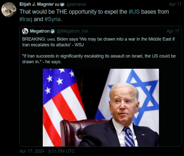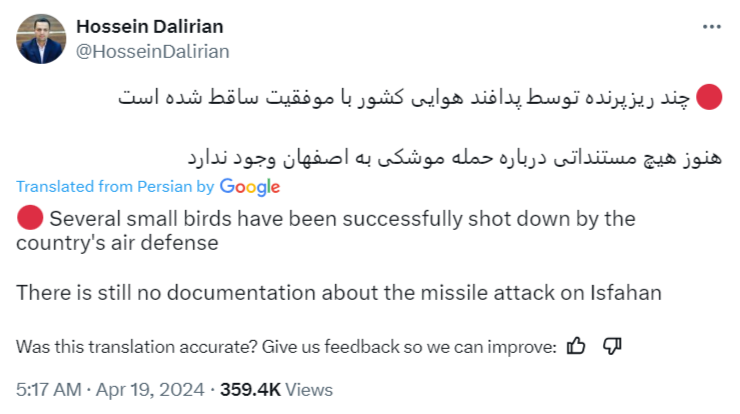 The propaganda seems to be inflating the “fake attack in #Isfahan” to stop the escalation so that #Israel doesn’t have to strike and #Iran doesn’t have to strike back. -