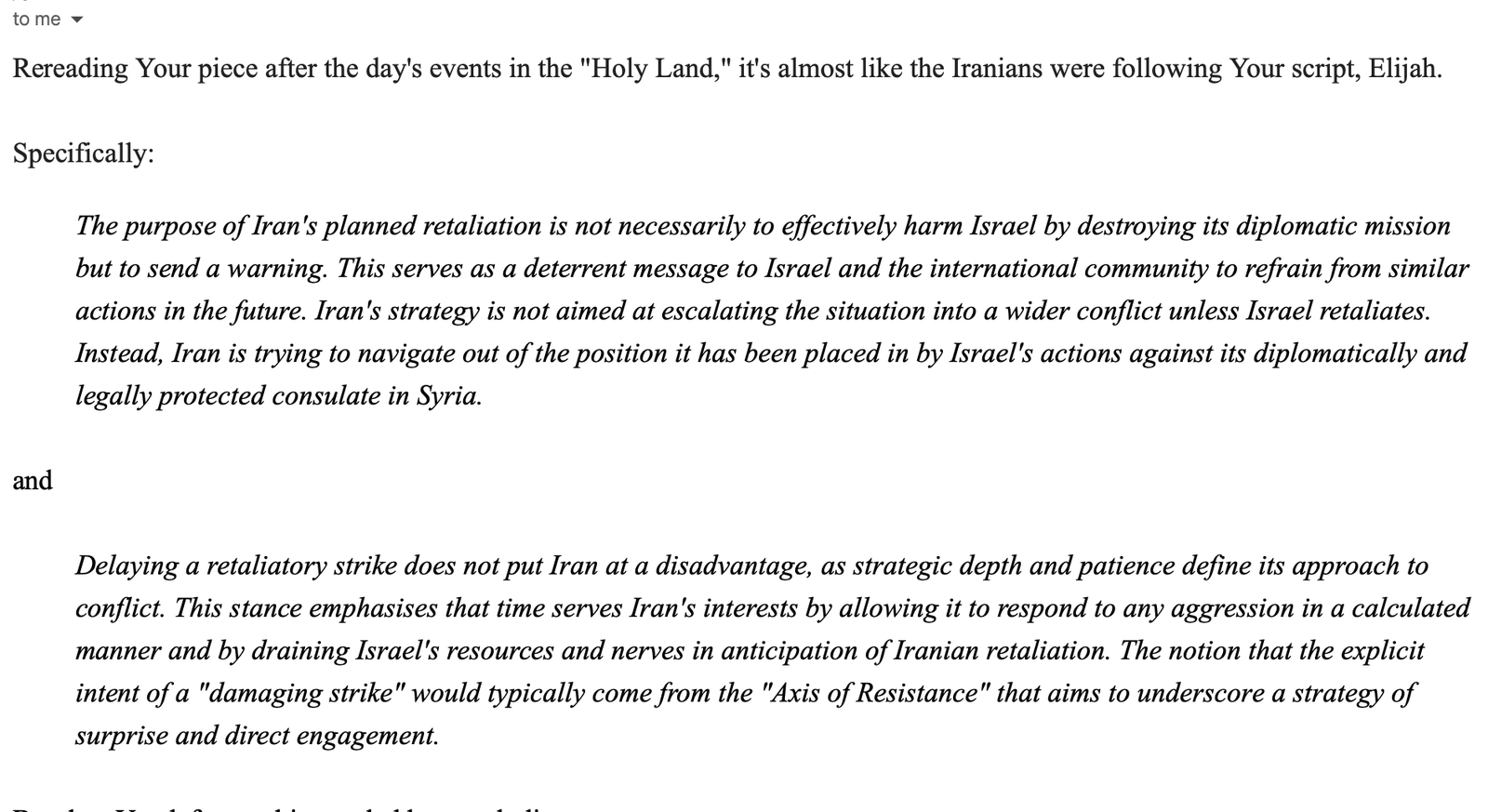 Home – Global Blog › Forums › The Hearty Salon › West Asia front Thread, 18 April 2024