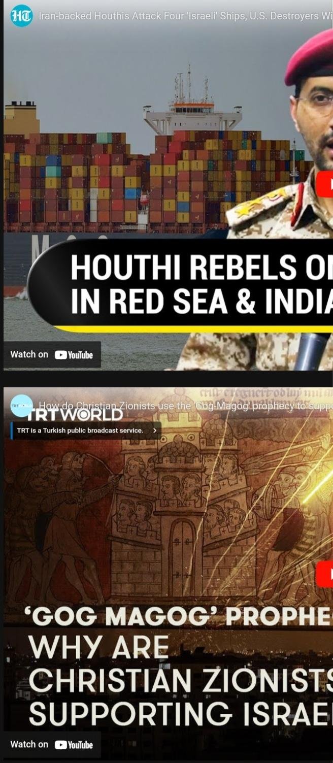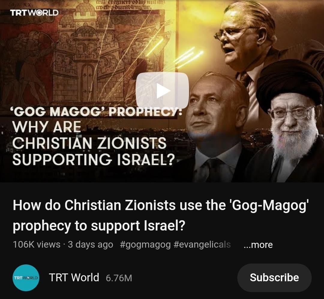 That is bizarre! โ๏ธโ๏ธ It shows for me, and I am using a VPN set to NYC… is there regional censorship within USA? I posted two videos. I doubt the Hindustan Times videos are being censored.. is it algorithms, whether regional, YT, or on WordPress that now blackout Christian Zionism, the topic of the second video? Could be the habitually hard-hitting Turk media (on this topic) too…If still can’t see, try the search term, “How do Christian Zionists use the ‘Gog-Magog’ prophecy to support Israel?” by TRT World media. Their screenshot looks like this: