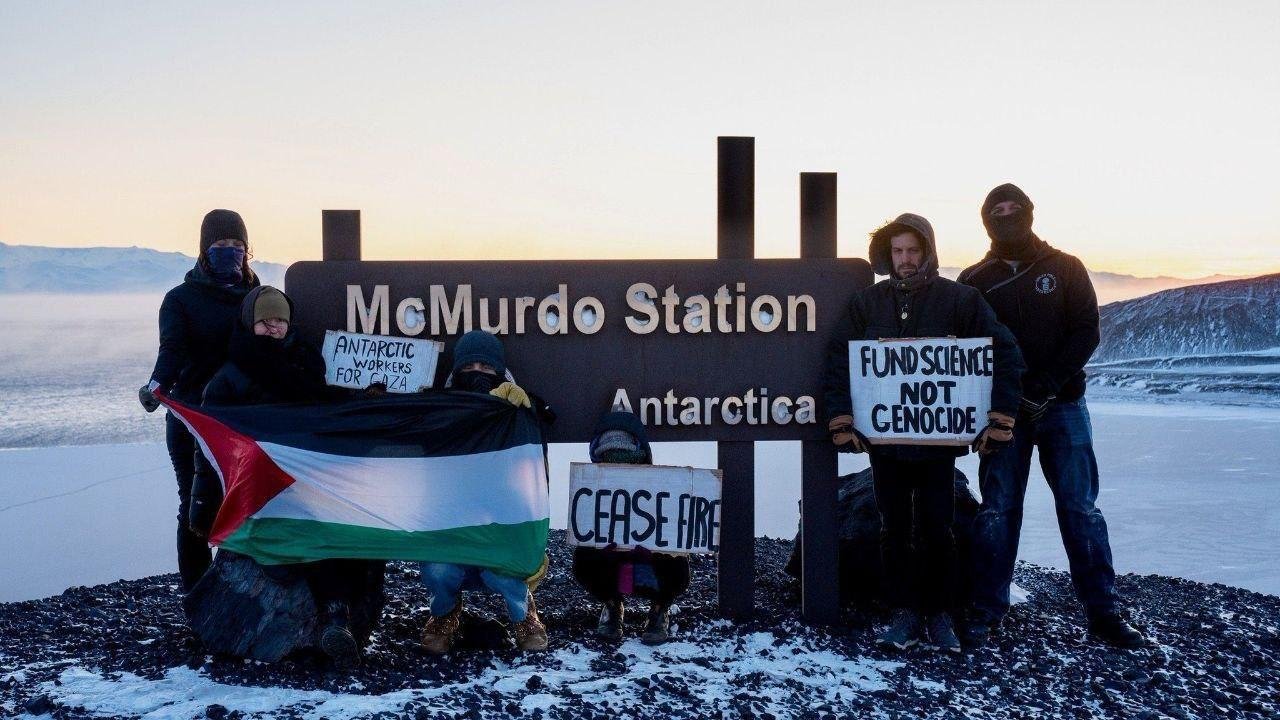 โญ Scientists at McMurdo Station in Antarctica unfurl the Palestinian flag in support of a ceasefire. One of the placards reads “fund science, not genocide”.