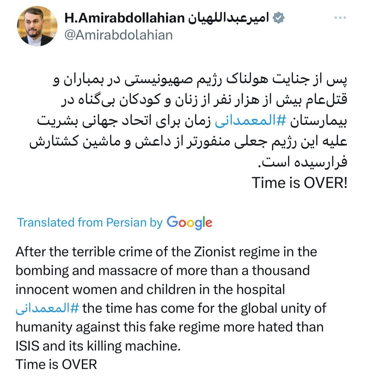 💬 “What the Zionist criminal forces carried out in their attack on the Baptist Hospital in the Gaza Strip constitutes one of the most heinous and bloodiest massacres against humanity in the modern era. The Syrian Arab Republic considers this massacre of hundreds of innocent people in Gaza to be a barbaric act that expresses the level of hatred of the Zionist entity, which with its crimes has exceeded the utmost levels of aggression and murder.This heinous crime only reminds us of the crimes of this entity that was established and founded on massacres, and reflects a stark picture of the continuation of the approach of the gangs that created the criminal Zionist entity. The Syrian Arab Republic holds Western countries, especially the United States of America, responsible for this massacre and other massacres, as it is a partner of the Zionist entity in all organized killing operations against the Palestinian people.”
