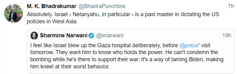 This informs why the panicked Empire is seeking to shut down the Gaza front. The Israeli military spokesman today said they would call off the ground invasion if Hamas leaders leave and they hand over the POWs. They are neither built for wars of attrition, nor have the manpower or logistics trains in West Asia, nor can take out Iran without involving Iran’s SCO big brothers..