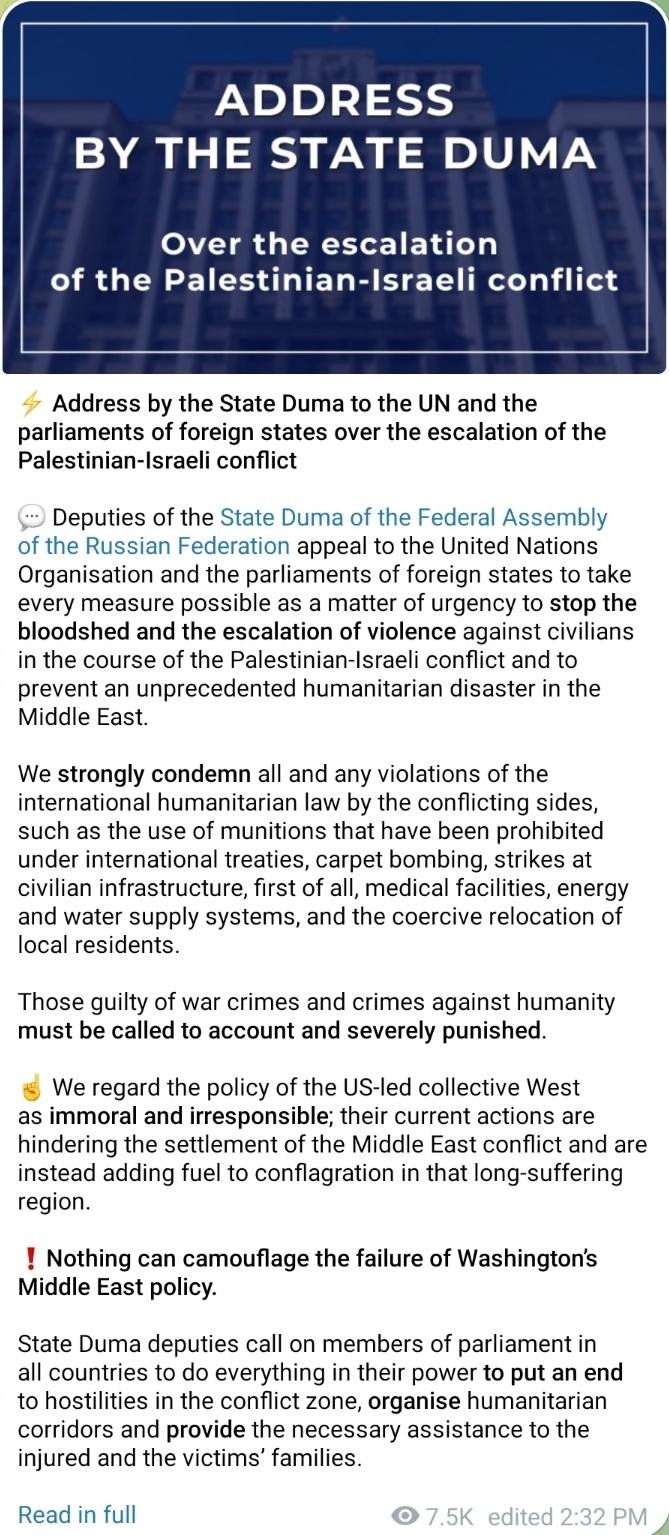 🇷🇺🇧🇷 📞 President Vladimir Putin spoke over the phone with President of the Federative Republic of Brazil Luiz Inacio Lula da SilvaThe rapidly deteriorating situation in the Palestinian-Israeli conflict zone was discussed in detail, with deep concern expressed for the growing number of civilian casualties and emphasis on the critical importance of rapidly achieving a ceasefire, evacuating foreign citizens from the Gaza Strip, and ensuring unhindered access of humanitarian aid to the enclave.