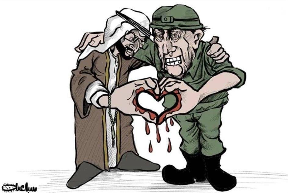 this is a brilliant illustration. At first I thought it was intended, but if you look carefully between the zionazi and the hypocrite compradore desert bedouin — you can see in their middle as the white space what appears the signal photo of the Gaza Genocide — the burial shrouds of the children. Complete with the blood splatter!