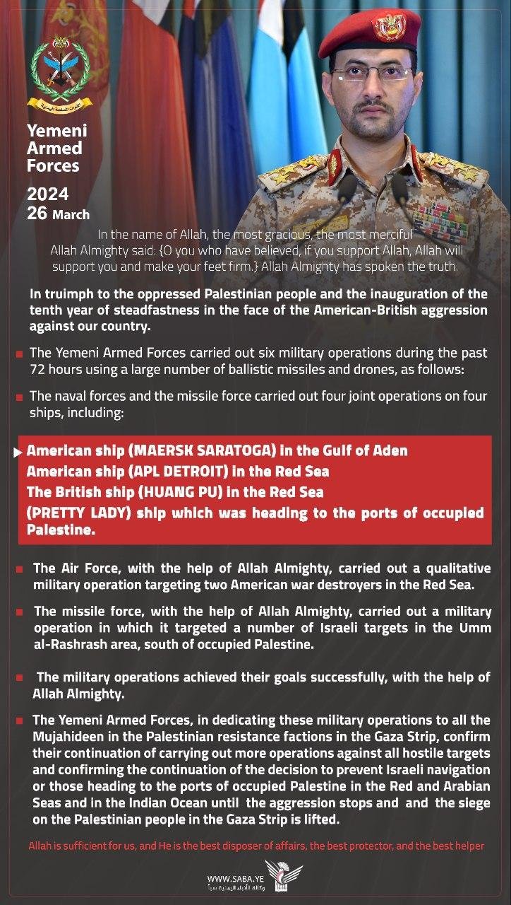 🇾🇪 We say to anyone who wants to stop our operations in the Red Sea, Arabian Sea, and the Indian Ocean, stop your aggression, lift your blockade, and end your occupation of our brothers in Palestine to end the problem. If you do that, what will happen? Is this an unfair concession to you? Is it a disaster for you? Is it a calamity for you?