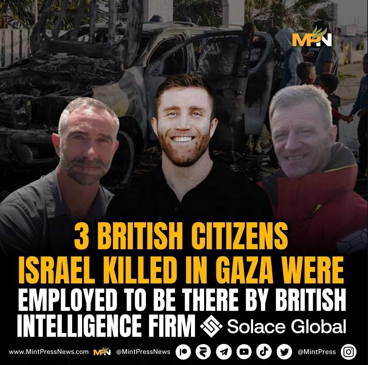 ⭕ ⬆️ The three British citizens killed by Israel in Gaza were British intelligence officers.Among the seven charity workers killed by Israel’s targeted attack on the World Central Kitchen aid convoy on Monday were three British citizens, all former military personnel serving as British military intelligence officials.