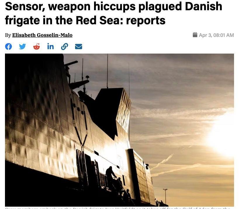 ⭕ Critical weapon and mission systems aboard the Danish frigate Iver Huitfeldt malfunctioned during the ship’s recent deployment to the Red Sea, as the ship was partaking in an international effort to protect maritime cargo traffic against attacks from Yemen’s Iran-backed Houthi militants, according to published reports.The “ship’s active phased array radar and the C-Flex combat management system” did not work it is noted in a leaked message. Further it was noted, “the unexplained outages were severe enough to prevent the frigate from launching its RIM-162 Evolved Sea Sparrow Missiles, also known as ESSMs, for roughly 30 minutes.” Ammo used in the 76mm guns was also found to be detective.