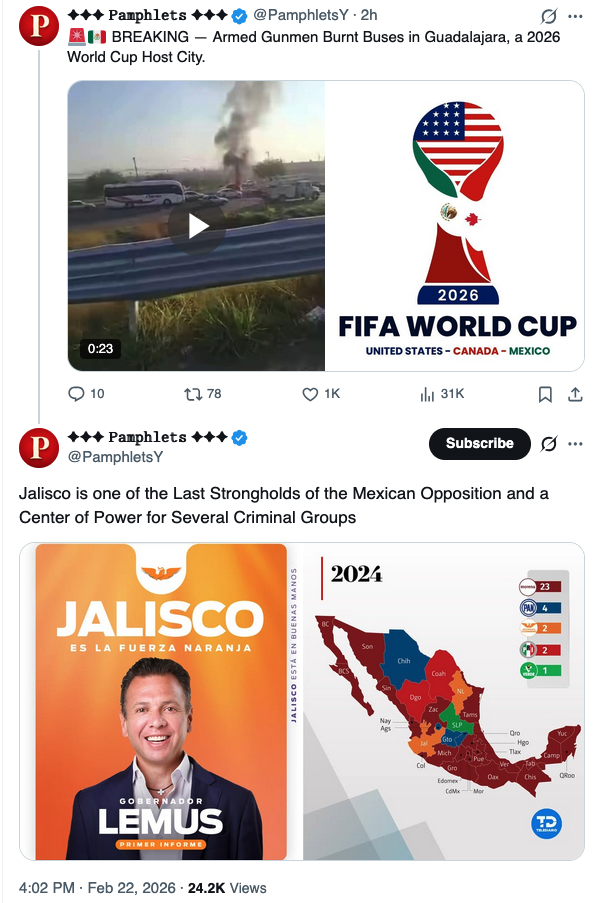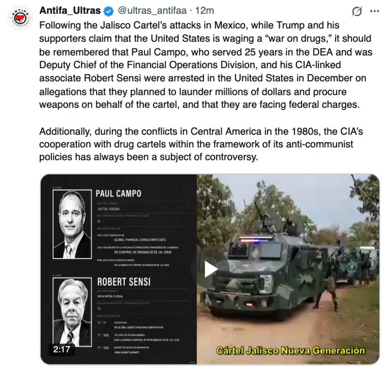 Keymaster. My personal take is that the cartels as well as many factions in government are either USA plants or compromised. So I did see that the Federales took out the cartel leader- as if they wanted the repercussions. We shall see. I am skeptical this whole thing is organic, the timing “coincidentally” matches the potential need to dial back pressure on Iran and also deal with that Russian first attempt at breaking the Cuba blockade…