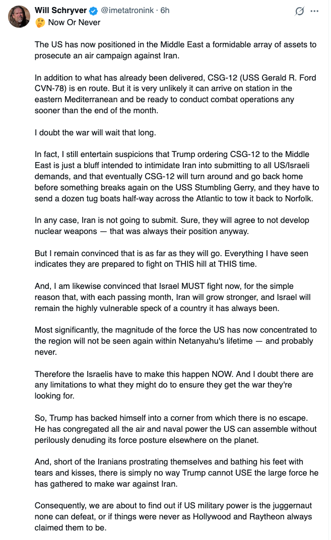 KeymasterEven airplanes are getting closer to obsolescence in warfare. Drones have taken out jets for both sides in Ukraine. Whenever I hear about refueling aircraft being staged so attack jets can actually get close enough to Iran to fire missiles and skedaddle, it doesn’t take much thought to figure out that the only reason they get away with that is because the rest of the world doesn’t operate on the same dark wavelength the west does. If I was Iran, I would send what I have to take out those tankers the moment they appear, without one care to whose “airspace” they are in. Without tankers, with vulnerable aircraft carriers… Power projection with aircraft has it’s limits.